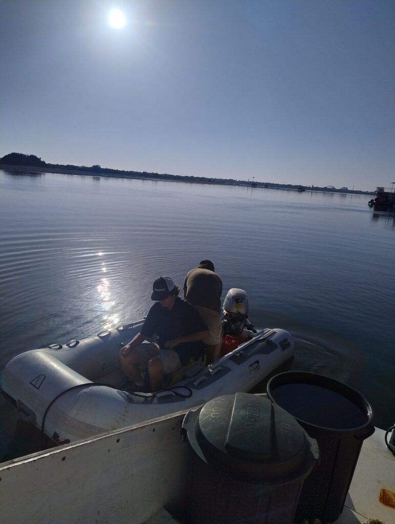 私たちのゴムボートを盗もうとして引っ張っている。